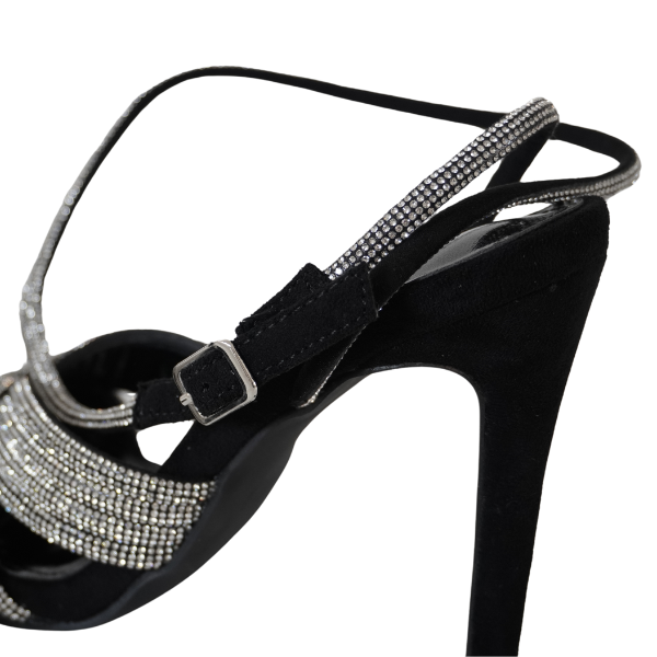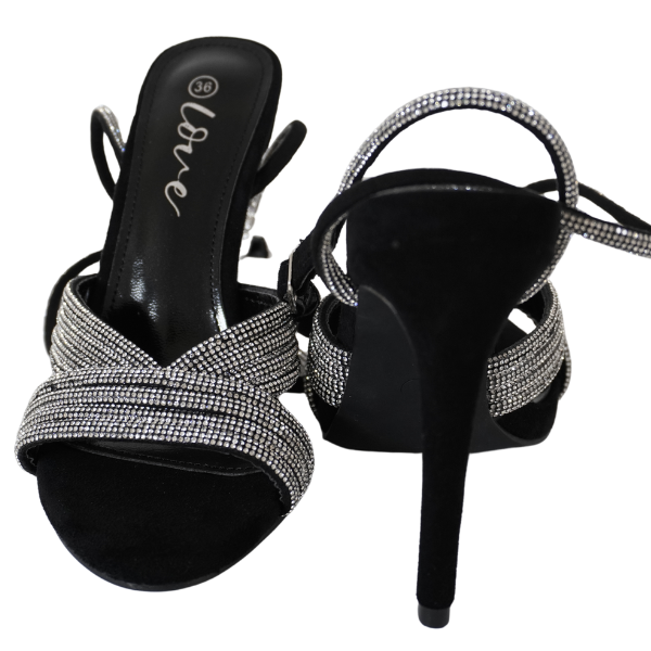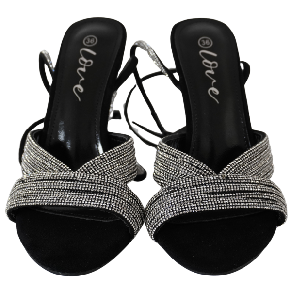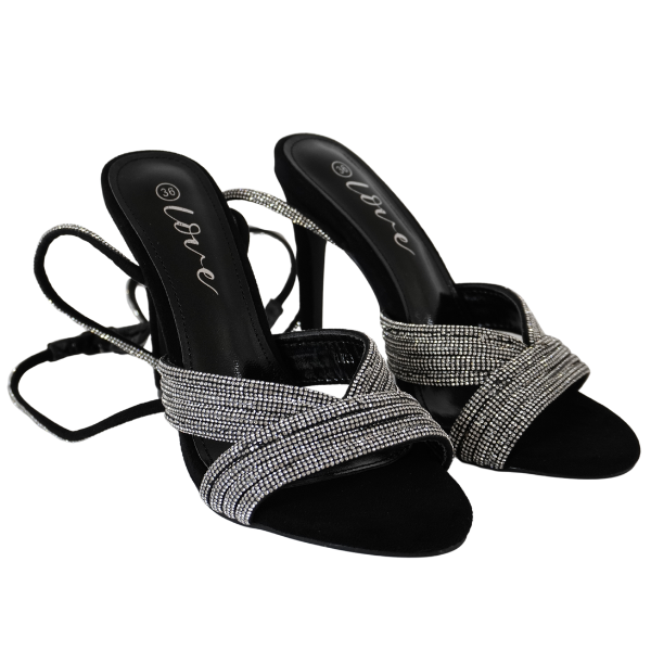 Aceste sandale elegante negre impresionează prin baretele încrucișate decorate cu strasuri strălucitoare, care adaugă un plus de rafinament fiecărei ținute.