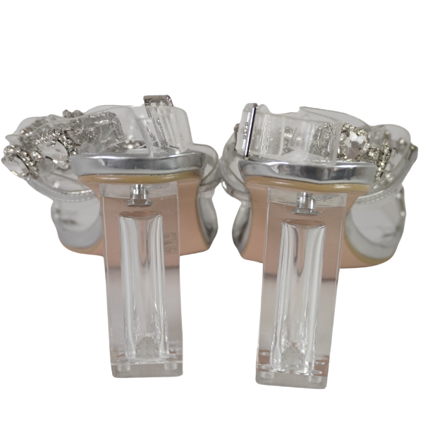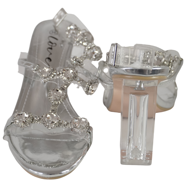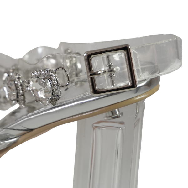 Sandale cu toc gros și barete transparente decorate cu strasuri - Argintiu