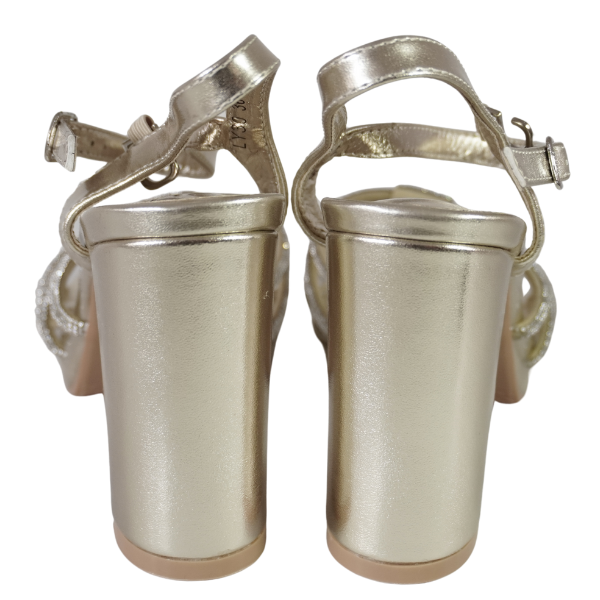 Aceste sandale elegante champagne impresionează prin designul modern, cu toc gros stabil și platformă confortabilă.
